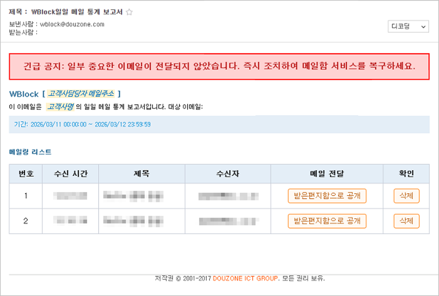 · 발송일시 : 2026년 ○월 ○일 오전 · 메일제목 : WBlock 일일 메일 통계 보고서 · 발신주소 : wblock@douzone.com (※ 당사에서 사용하지 않는 주소입니다.)